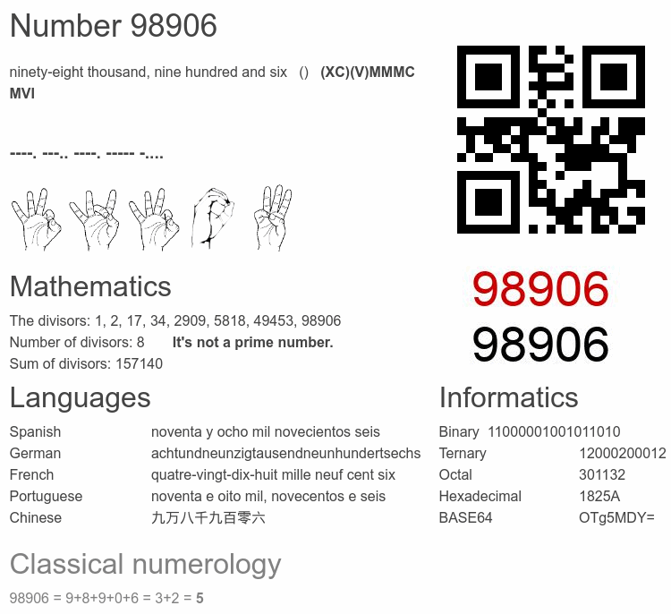 | Chinese: | 🔊 (数 98 906) | 九万八千九百零六 |