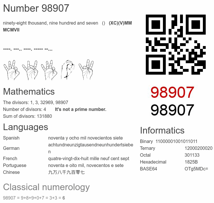| Chinese: | 🔊 (数 98 907) | 九万八千九百零七 |
