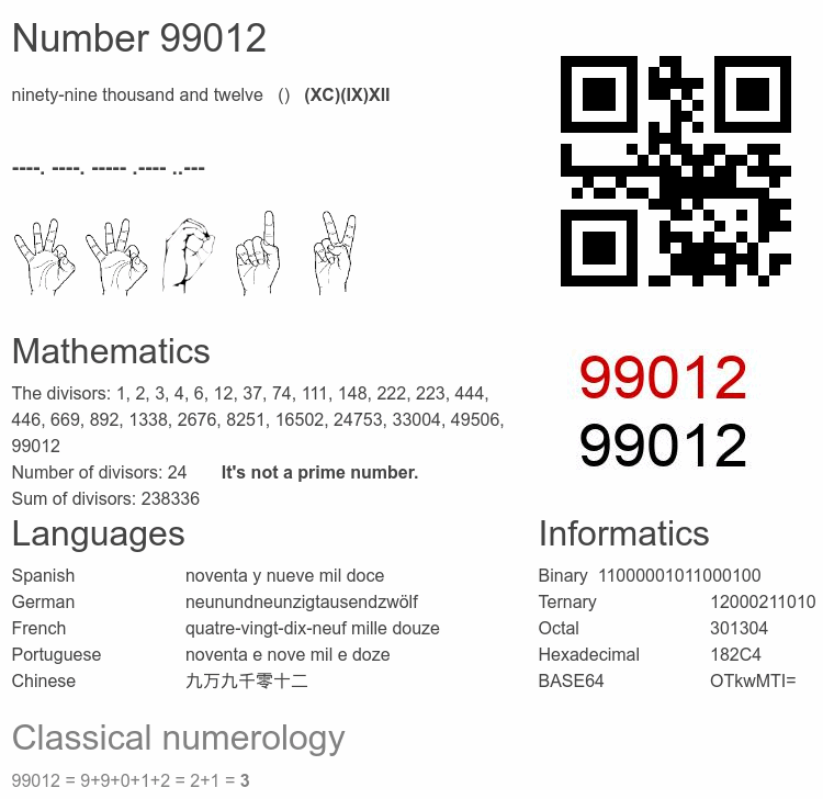 | Spanish: | 🔊 (número 99.012) | noventa y nueve mil doce |