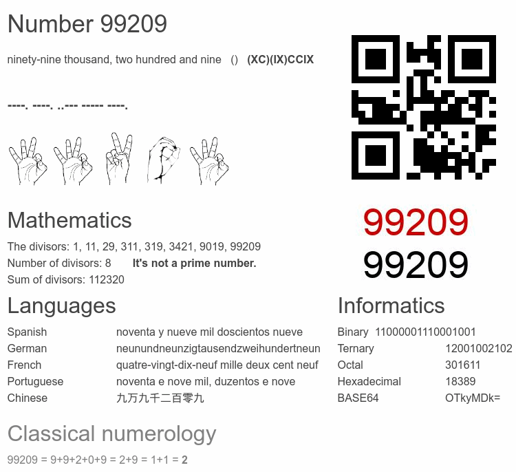 | Spanish: | 🔊 (número 99.209) | noventa y nueve mil doscientos nueve |