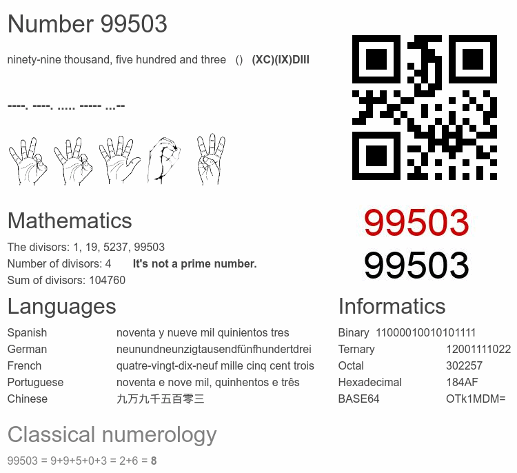 | Spanish: | 🔊 (número 99.503) | noventa y nueve mil quinientos tres |