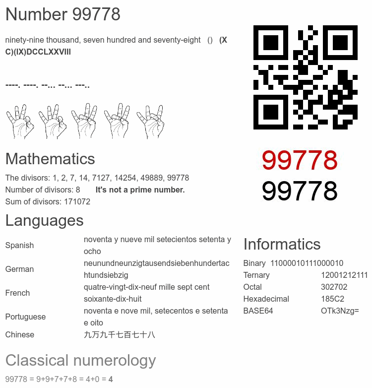 | Spanish: | 🔊 (número 99.778) | noventa y nueve mil setecientos setenta y ocho |
