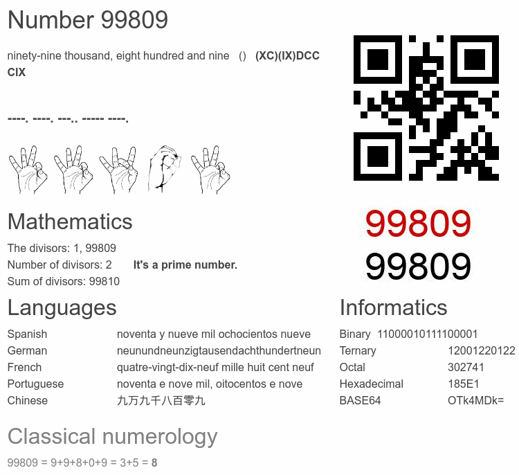 | Chinese: | 🔊 (数 99 809) | 九万九千八百零九 |