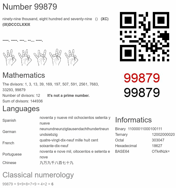 | Spanish: | 🔊 (número 99.879) | noventa y nueve mil ochocientos setenta y nueve |
